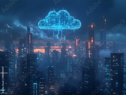 © Pixel Alchemist, Obraz premium Futuristic cityscape with digital cloud