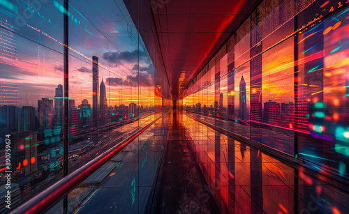 © Curioso.Photography, Fototapeta premium Futuristic cityscape with digital data and stock market graphs overlay at sunset.