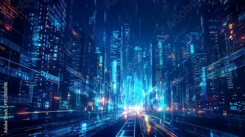 Naklejka premium Futuristic Cityscape with Digital Effects and Neon Lights