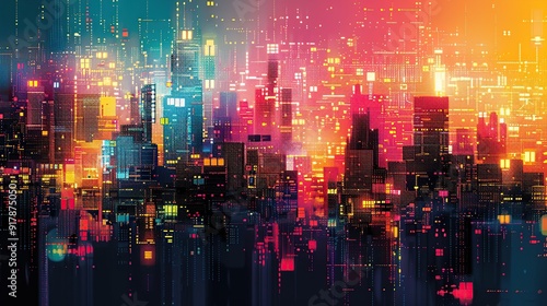 © Jajang, Fototapeta premium Futuristic Cityscape with Digital Glow