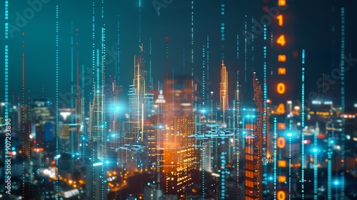 Fototapeta premium Futuristic Cityscape with digital lights and glowing towers representing...