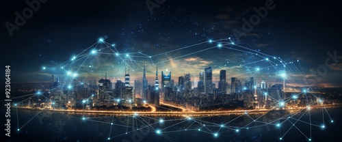Obraz premium Futuristic cityscape with digital lines and data connections in the sky, wide-angle shot, city skyline at night with illuminated skyscrapers, futuristic technology concept, wide panorama.