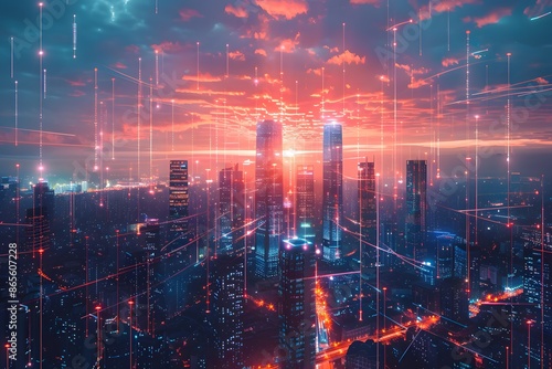 © Valentin, Naklejka premium Futuristic Cityscape with Digital Network Overlay at Sunset