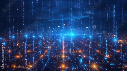 © vanzerim, Obraz premium Futuristic Cityscape with Digital Rain