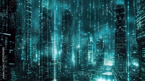 © buraratn, Obraz premium Futuristic Cityscape with Digital Rain Effect