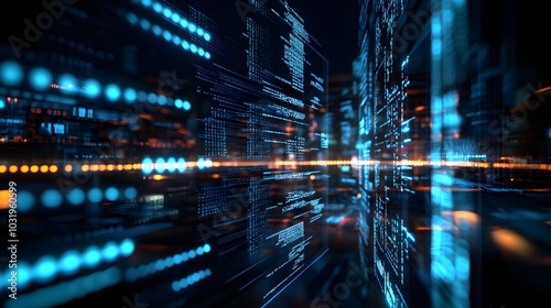 Obraz premium Futuristic Cityscape with Dynamic Digital Lights and Architectural Skyscrapers