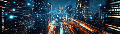 © Sunshine, Naklejka premium Futuristic Cityscape with Dynamic Light Trails and Digital Connections at Night