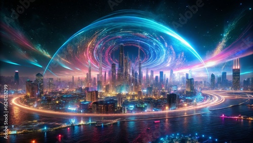 © Arethaawykoff, Fototapeta premium Futuristic Cityscape with Energy Swirls