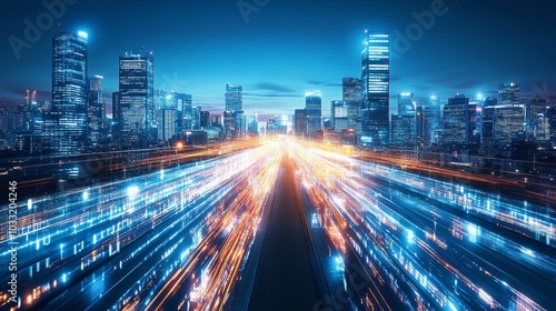 Obraz premium Futuristic Cityscape with Fast Moving Lights and Skyline