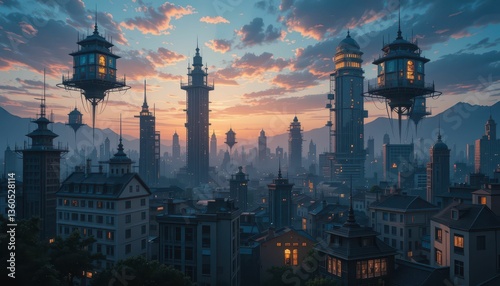 © Kitta Studio, Fototapeta premium Futuristic Cityscape with Floating Towers at Sunset in Dreamlike Atmosphere