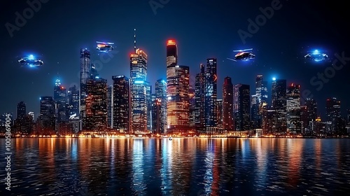 Obraz premium Futuristic Cityscape with Flying Cars at Night