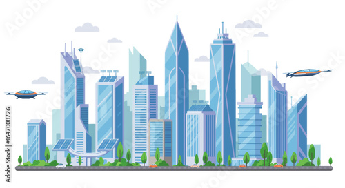 Fototapeta premium Futuristic Cityscape with Flying Drones and Solar Panels