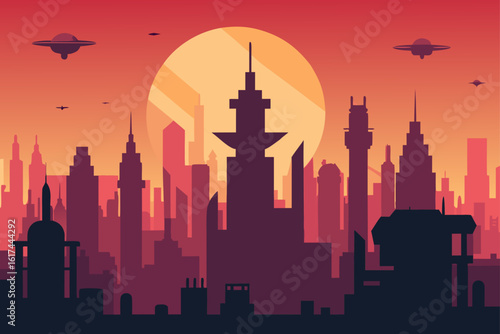 Fototapeta premium Futuristic cityscape with flying saucers under a large sunset