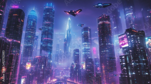 © BerkahStock, Fototapeta premium Futuristic Cityscape with Flying Vehicles