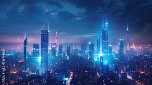 Obraz premium Futuristic cityscape with glowing blue neon lights