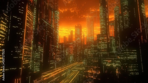 © Justlight, Fototapeta premium Futuristic cityscape with glowing buildings and flying vehicles at sunset, showcasing advanced technology and urban development in a vibrant metropolis