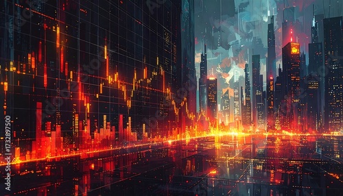 © Mbecex, Naklejka premium Futuristic cityscape with glowing charts