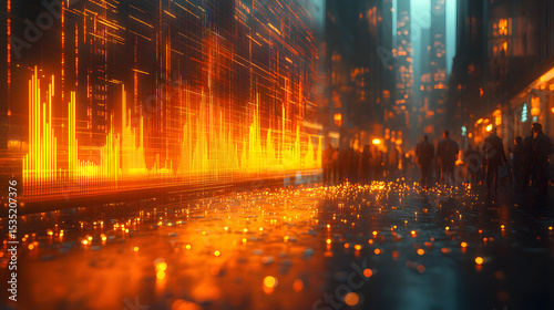 © 淑红 蔡, Fototapeta premium Futuristic Cityscape with Glowing Data Streams and Reflections on Wet Streets