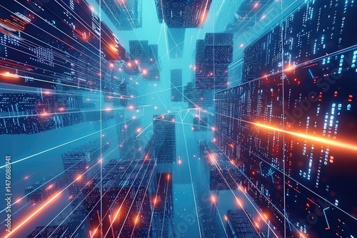 Obraz premium Futuristic cityscape with glowing digital pathways.