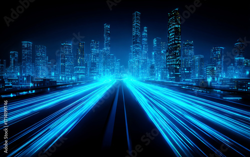 Fototapeta premium Futuristic cityscape with glowing light trails representing high - speed technology