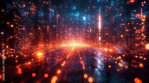 Obraz premium Futuristic Cityscape with Glowing Lights and Data Streams