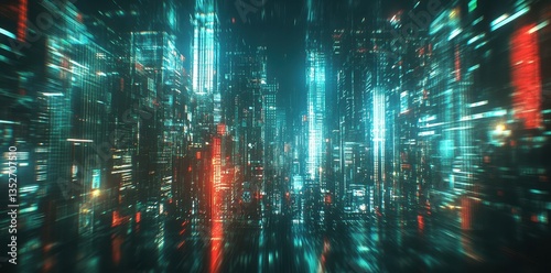 © NpicArt, Obraz premium Futuristic cityscape with glowing lights and skyscrapers at night