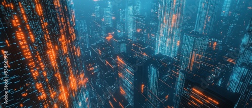 Obraz premium Futuristic Cityscape with Glowing Lines and Data Stream, Cyberpunk City, Neon...