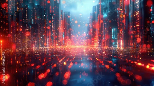 © NDmCX-Nic, Fototapeta premium Futuristic cityscape with glowing neon lights and a digital river flowing through it. The city is bathed in a vibrant, colorful light.