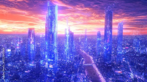 © Iswanto, Fototapeta premium Futuristic cityscape with glowing skyscrapers under a vibrant sunset.