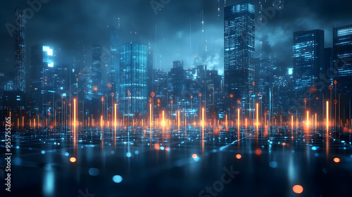 © Siasart, Fototapeta premium Futuristic cityscape with glowing soundwave visualizations.
