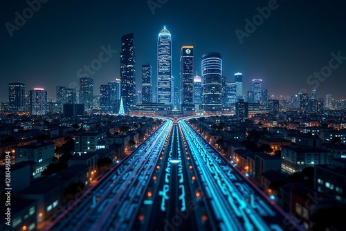 Obraz premium Futuristic cityscape with glowing structures and digital pathways, showcasing...