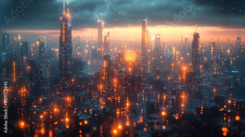 © julija, Fototapeta premium futuristic cityscape with holographic security interfaces aipowered surveillance glowing network connections