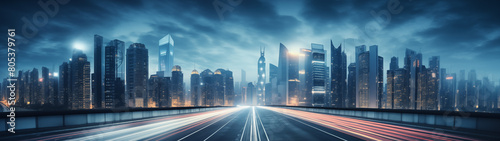 Fototapeta premium Futuristic Cityscape with Illuminated Skyscrapers at Night