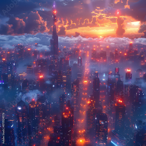 © Kakabe, Obraz premium Futuristic cityscape with illuminated skyscrapers at sunset, blending vibrant urban lights and dramatic clouds in a stunning skyline view.