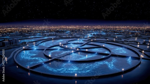 Obraz premium Futuristic cityscape with illuminated waterways and digital networks at night