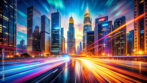 © HabibaAkter, Fototapeta premium Futuristic Cityscape with Light Trails and Modern Architecture at Night