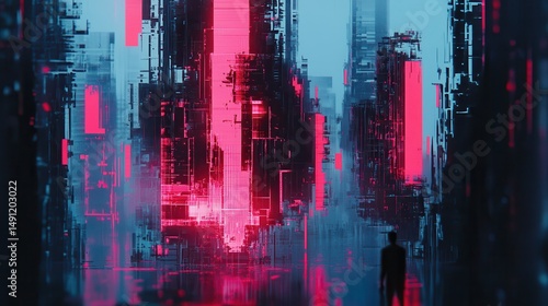 Obraz premium Futuristic Cityscape with Neon Lights and Abstract Digital Elements