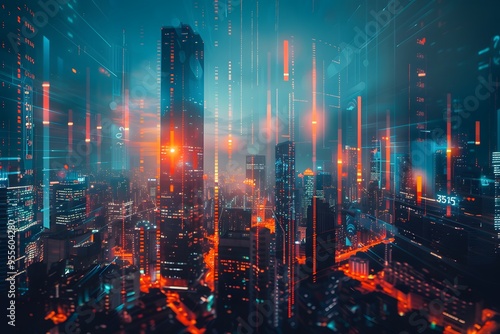 © Valentin, Fototapeta premium Futuristic Cityscape with Neon Lights and Data Streams