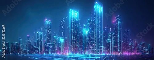 Fototapeta premium Futuristic Cityscape with Neon Lights and Digital Effects at Night
