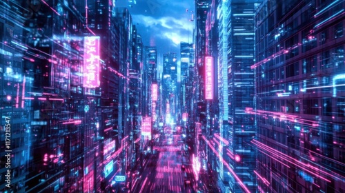 Fototapeta premium Futuristic cityscape with neon lights and digital effects, evoking a...