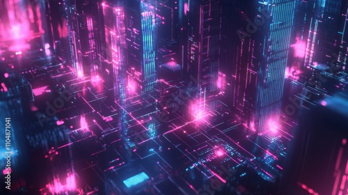 © TopMedia, Naklejka premium Futuristic Cityscape with Neon Lights and Digital Elements