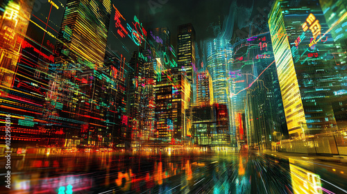 © Panida, Fototapeta premium Futuristic Cityscape with Neon Lights and Digital Glitch Effect