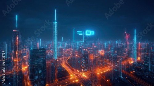 © vanzerim, Fototapeta premium Futuristic Cityscape with Neon Lights and Digital Interface