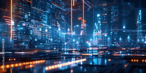 Naklejka premium Futuristic Cityscape with Neon Lights and Digital Interfaces
