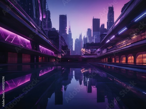 © MollahArif, Fototapeta premium Futuristic cityscape with neon lights and geometric buildings Generated by Ai