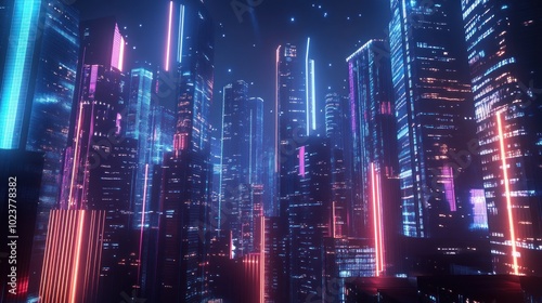 Fototapeta premium Futuristic cityscape with neon lights and stars