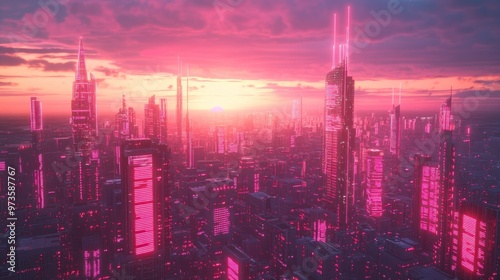 Fototapeta premium Futuristic cityscape with neon lights at sunset.