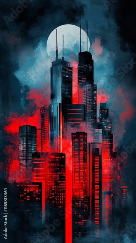 Obraz premium Futuristic Cityscape with Red and Blue Fog Under a Full Moon