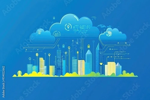 Obraz premium Futuristic cityscape with security locks and data flow emanating from clouds