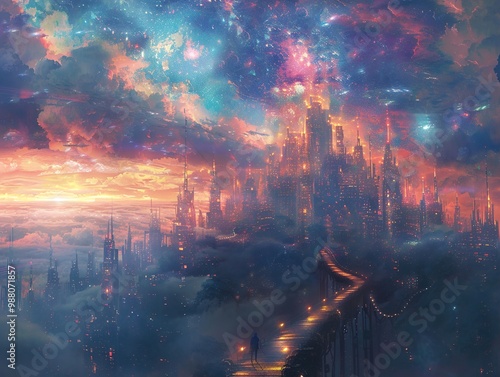 © Infinity, Obraz premium Futuristic Cityscape with Starry Sky and Sunset